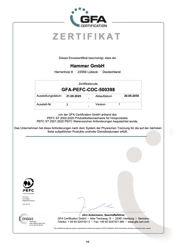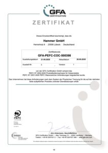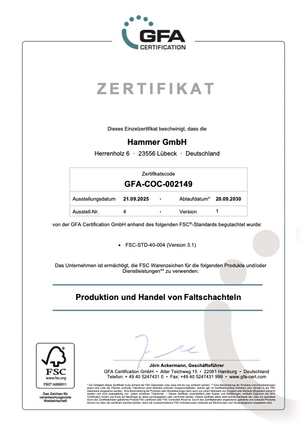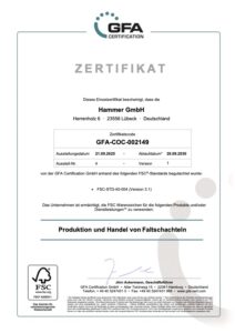 Seit 1999 sind die Hammer-Verpackungswerke ein nach ISO 9001 zertifiziertes Unternehmen, das bei seinen Kunden als zuverlässiger Partner gilt.